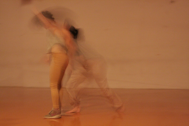 Un bolso con algo de ropa queda solitario en el centro de la sala de Café Müller. Su rol en la puesta será el de recibir algunas ropas de Beli, quien se desvestirá de la cintura para arriba en varios movimientos repetitivos. Más luego, Daiana lo dejará a un lado en la penumbra de otro pasaje más cercano al final. El bolso, la ropa, la semidesnudez, sin embargo, no serán más que detalles que conforman mínimamente el qué de la obra, que apunta más allá de lo que vemos y percibimos cuando un cuerpo se mueve rutinariamente.