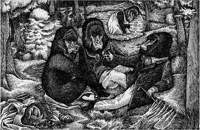 En ese sentido, y pese a lo que el prólogo pretende, Arispe es muy tajante –y hasta estereotipado– en la división social que marca de uno y otro lado. Si la última imagen genera dudas en torno a esta dicotomía, es porque presenta una escena religiosa, acaso uno de los pocos aglutinadores que –lamentablemente– ha tenido el país a lo largo de su historia. No es casual, sin embargo, que la ceremonia esté oficiada por un gorila, y que también sean simios los principales participantes, mientras los humanos quedan relegados a sectores más alejados del púlpito o a papeles accesorios del rito.