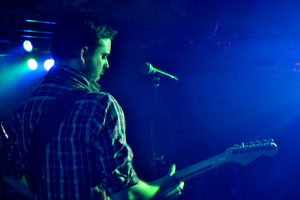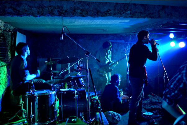 “Para sentirte bien hacé lo que querés, mirá lo que llevás, soltá las piedras”, arranca un rato después Mi Pequeña Muerte con “Los animales”, tercer tema de su último disco, El triunfo de la paz. La banda tiene la potencia de un rayo que cae sobre el mar. Suena clara y prolija, y la distorsión de las guitarras no molesta en los oídos. El bar, con capacidad estimativa para 300 personas, está a tope. Todos jóvenes de entre veinte y trentilargos vestidos según la moda indie. El escenario recuerda la puesta en escena de la obra de teatro Cineastas, de Mariano Pensotti. La pared del fondo del local está dividida en dos. En la parte inferior hay una barra y un agujero con unas cortinas a través del cual la gente puede dirigirse a los baños. Arriba, como si fuese en otro plano de la misma realidad, toca la banda. El cantante, que es alto, tiene que agacharse un poco para no chocar con el techo. Entre él y el bajista, sentado en el entrepiso, hay un flaco con elementos de percusión.