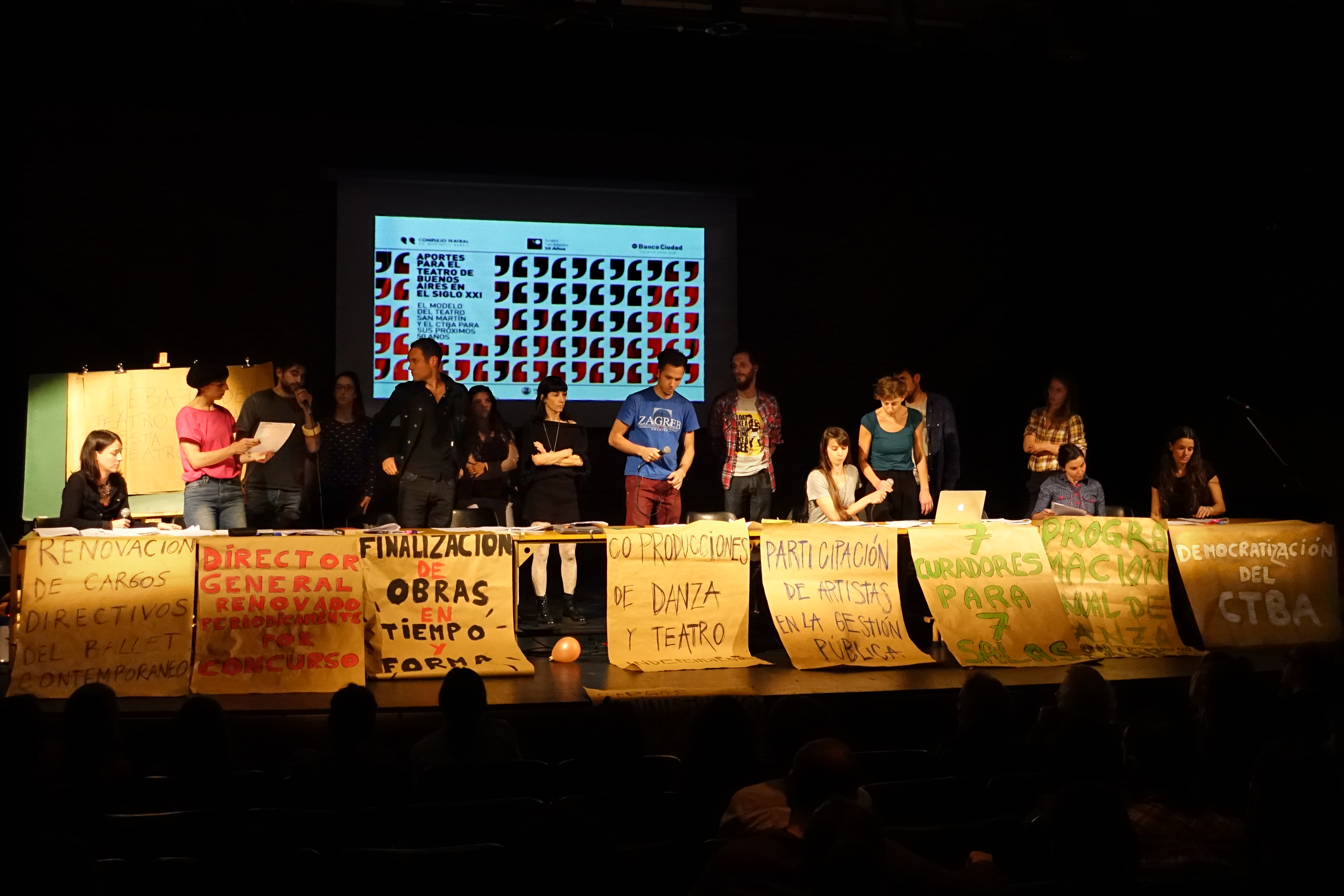 Hacia el final, los “conferencistas” convirtieron las denuncias en reclamos y propuestas: “Director general renovado periódicamente por concursos”; “siete curadores para siete salas, un curador para cada sala que la programe con criterios que se justifiquen públicamente”; “democratización del CTBA”; “el armado de un observatorio de la gestión de teatro integrado por artistas, directores, profesores, técnicos, que evalúen la programación anual de danza contemporánea”; “finalización de obras edilicias en tiempo y forma”; “renovación de cargos directivos del Ballet Contemporáneo”; “coproducciones para danza y teatro independiente”; “cargos administrativos y técnicos dirigidos por concurso”; “participación de artistas en la gestión pública”.
