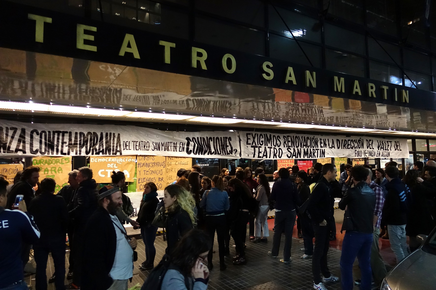 Las pintaron en los papeles madera y llamaron a compartir con los celulares sus pegatinas en la puerta del San Martín: la apropiación de la propuesta, la colectivización de la batalla por lo público. “Todos los que estamos acá dirigimos, actuamos, escribimos, bailamos pero también producimos , gestionamos nuestras compañías, nuestras salas, nuestros encuentros”, concluyeron para comenzar la arenga. “Sabemos lo que significa tomar decisiones, defender criterios artísticos, hacer presupuestos, buscar fondos, pelear para habilitar nuestras salas. Y por eso pensamos que tenemos derecho a intervenir en cómo se gestionan nuestras instituciones oficiales. Esta conferencia es el primer paso en una serie de acciones para recuperar el teatro público como un espacio de producción y experimentación para el teatro y la danza”.