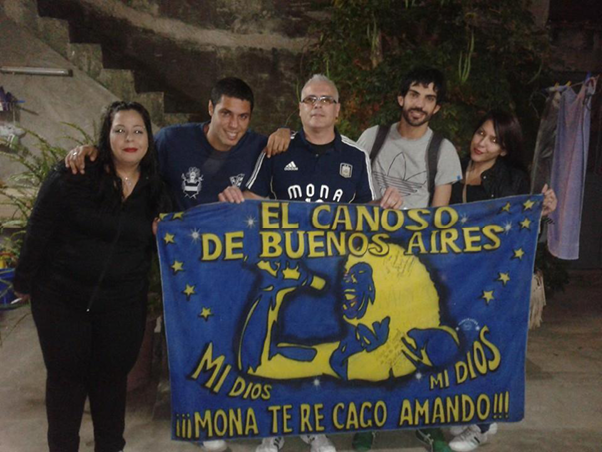 Hacia allá vamos, hacia la previa, otra parte ineludible del ritual. Pero todavía falta. Ahora una voz metálica y de tonada española sale del GPS del celular y dice “haz llegado a destino”. El destino es la casa del Canoso: pasillo al fondo, un patio con algunas macetas, puerta al comedor. Lo primero que se ve son cuadros. En los cuadros, él y La Mona. Son los tesoros, ahí, grandes, colgando de la pared que uno se choca al dar el primer paso; porque eso es lo que hay que ver: al Canoso con La Mona. Un abrazo, un pico, otro abrazo. Ahí Él, siempre con una sonrisa surcándole la cara.