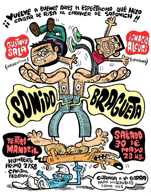 Sonido bragueta, show de stand-up de Gustavo Sala e Ignacio Alcuri, en Teatro Mandril, Humberto Primo 2758, Ciudad de Buenos Aires. A las 23. A la gorra.