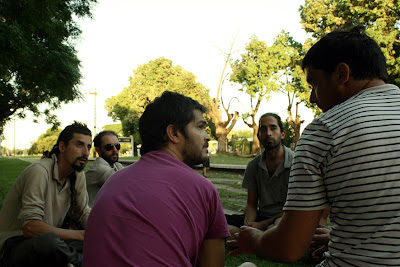 Hace calor y nos sentamos sobre el pasto en plan picnic vespertino a metros de los andenes en desuso de la ex estación de trenes Circunvalación –ramal cerrado durante la última dictadura militar–, donde la vieja edificación devino en Centro Cultural. De los manija están Toni Santamarta (primera guitarra) y Sebastián Morro (segunda guitarra y coros) y de los Engrupe: Hernán Figueroa (primera guitarra), Sebastián Cavilla (bajo y coros) y Horacio Quiroga (frontman, guitarra y composición). El cuadro se completa con el desopilante Ricardo Mascarpone, piano, percusión, bandoneón y presentador de El Engrupe.
