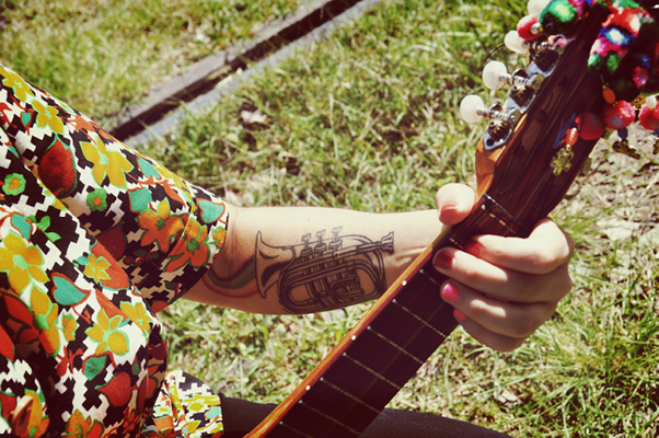 “El deseo de hacer música me atraviesa de repente. Hay momentos en los que muero por hacer una canción.” Sofía Viola jura ante el grabador de NaN. Y durante la siguiente hora y media el aparato será inútil en la tarea de registrar las reflexiones de esta cantora veinteañera que charla mucho pero más habla a través de los símbolos con los que se adorna a sí misma y a sus instrumentos, extensiones de su cuerpo. Una trompeta dispara desde su antebrazo derecho un arco iris de colores que sube por su hombro y se le escabulle en el corazón. “No tengo otra cosa en el cuerpo, siempre hay algo en mí conectado con la música”, completa el dibujo, anclado para siempre en su piel.